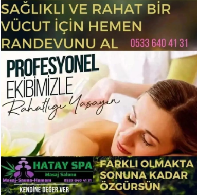 Hatay’da Benzersiz Spa Deneyimi: Stres ve Yorgunluğa Veda Edin Hatay’ın kalbinde bulunan Hatay Spa Masaj Salonu, yoğun şehir hayatının yorgunluğunu atmak ve bedeninizi yenilemek için ideal bir kaçış sunuyor. Günümüz yaşamının getirdiği stres ve kas ağrılarının çözümünde, spa ve masaj terapileri etkili bir çözüm sunarken, Hatay Spa Masaj Salonu profesyonel hizmetleri ile size özel bir deneyim yaşatıyor. Hatay Antakya’da rahatlamak ve enerjinizi yenilemek için aradığınız tüm hizmetleri sun